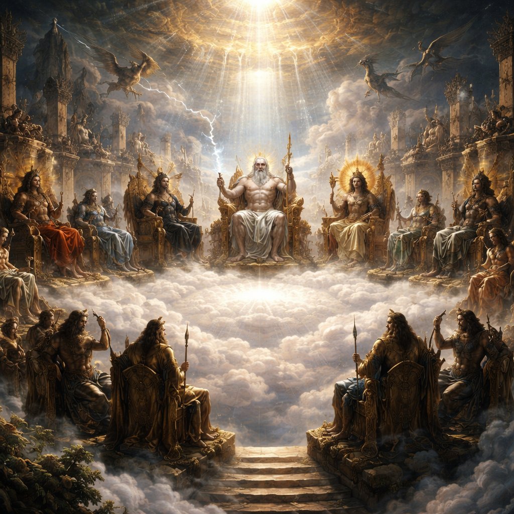 A conclave of many gods including Zeus, Ra, and Odin on thrones in a giant coliseum with the center being cloud covered