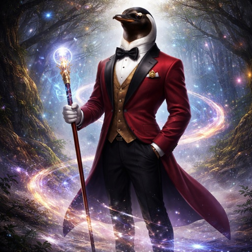 A man with a penguin head, dressed in red tuxedo, and is holding a cane