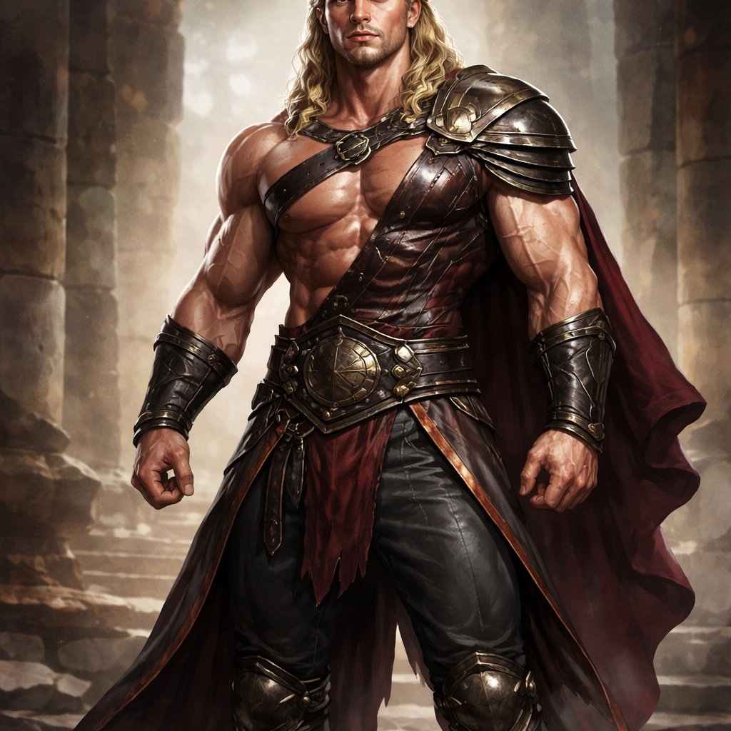 A tall well~proportioned figure/body with “broad-shoulders, thick neck, giving an impression of sheer power”. He has “rippling muscles on his, arms, chest, and legs”. His haircut is a blonde mullet. His “expression is often serene or determined, with deep-set blue eyes and strong brows, hinting at inner depth". He works at freak show as a strong man. His outfit consistsed of a modern gladiator style outfit but with pants.