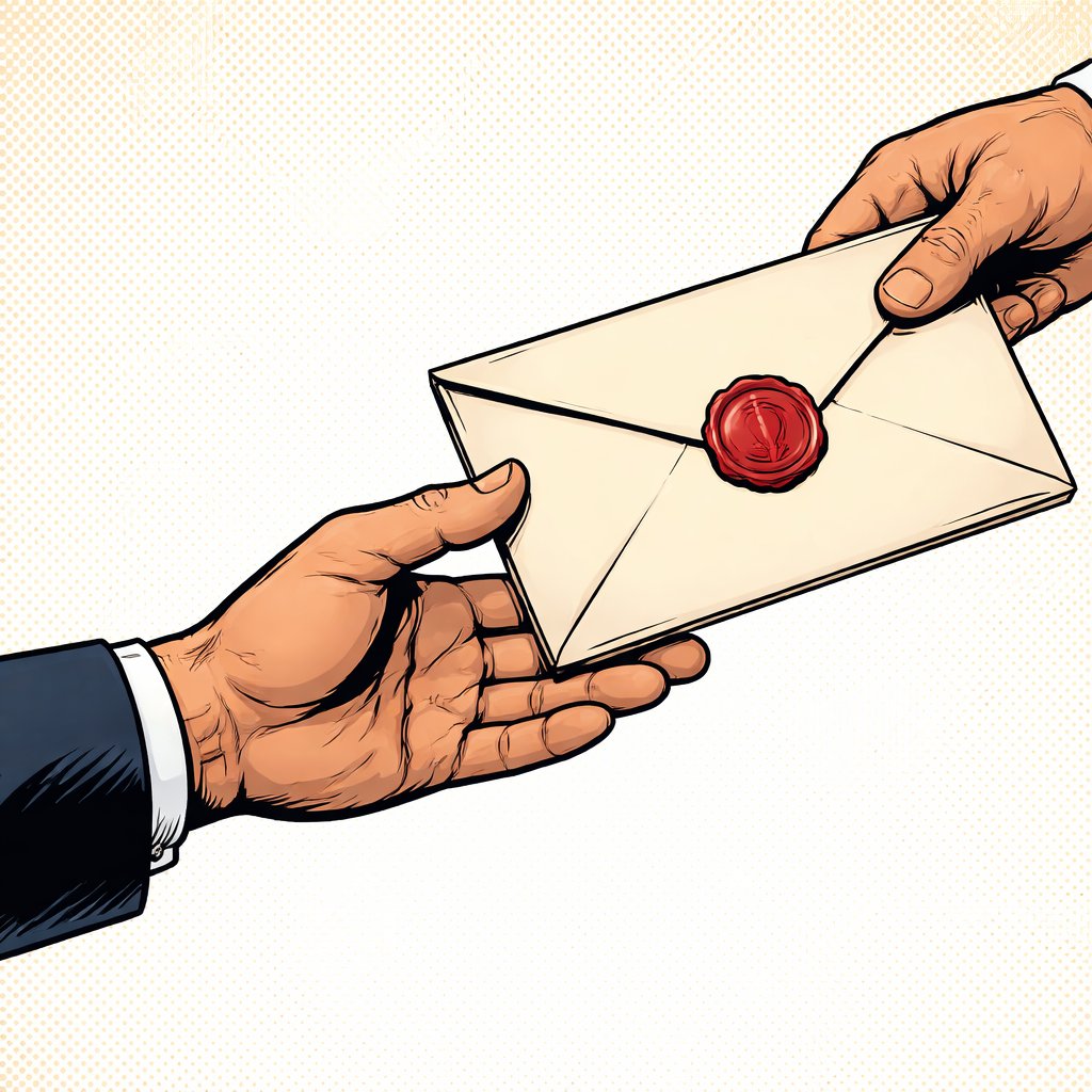 Realistic, refined, no caricature a right hand extended, receives an envelope with a red seal