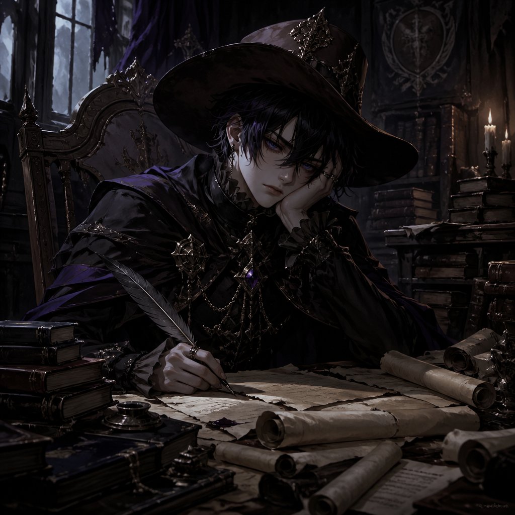 An 18 year old prince who has black hair with purple stripes and blue eyes. He is wearing all black and a black cape. He is wearing a big brown on his head. He is sitting at a desk. Behind him is a big shelf of books of all different sizes. There are blank sheets of paper that cover his desk. He is holding an ink pen in his left hand. He looks bored and tried. The room is dark and has little light.