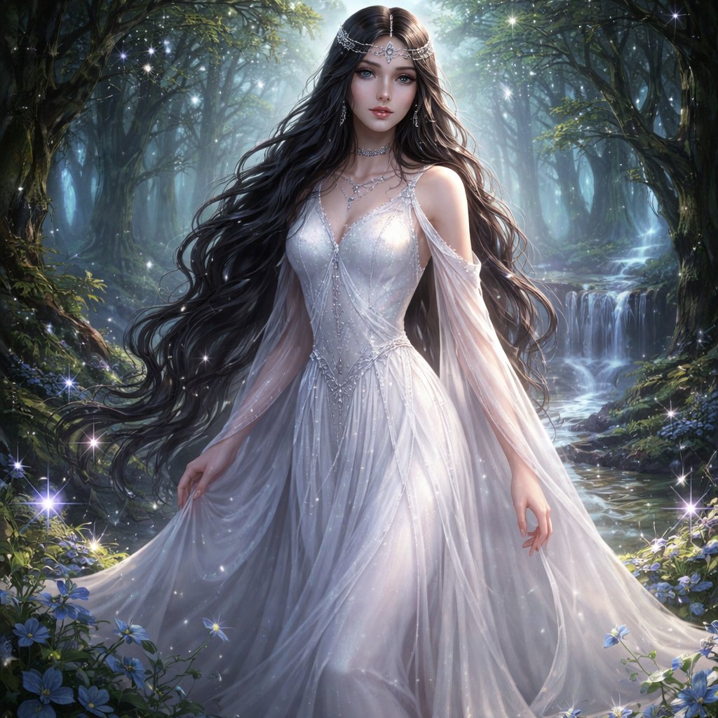 The elf Lúthien standing in a beautiful forest casting a trance spell