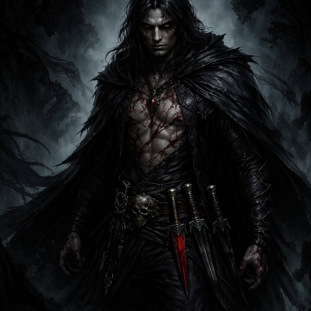 Necromancer Reb the bloody cut scars all over his body long black hair black cloak black pants three daggers on his belt one stylish red one stylish black the other a worn blade