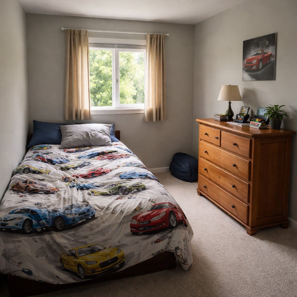 A room that has a twin sized bed in the left corner of the room. The bed has sheets that have pictures a cars in them. T...