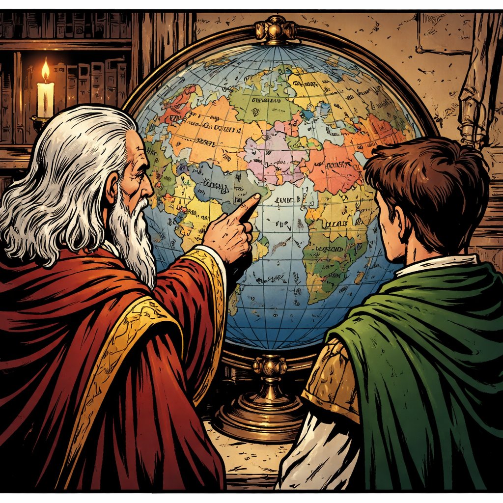 Realistic refined no caracature no speech bubble. Two men in renaissance robes are looking at a large globe of fake countries. One man points at at a place on the globe. We see them from the rear. One is old one is late 20s