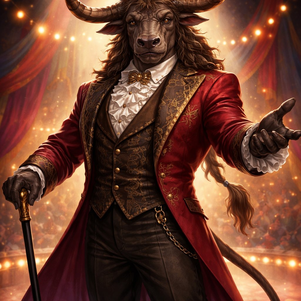 A male Minotaur that’s 6 1/2 feet tall. He has a smooshed humanoid-Cretan bull face with deep set bovine like brown eyes. On his Head were large powerful gleaming curved horns like his fathers. He has a well~proportioned figure/body and a long tail, with his skin/fur a captivating Taupe color. And his hairstyle is a taupe mullet. He works at freak show as the ringmaster. His outfit consists of a crimson tailcoat, frilly shirt, stunning blazer, pants and top hat. His abilities are Reality Rejection, Time Manipulation (Chronokineses), Zoolingualism (Language of Cattle only), Human Speech.