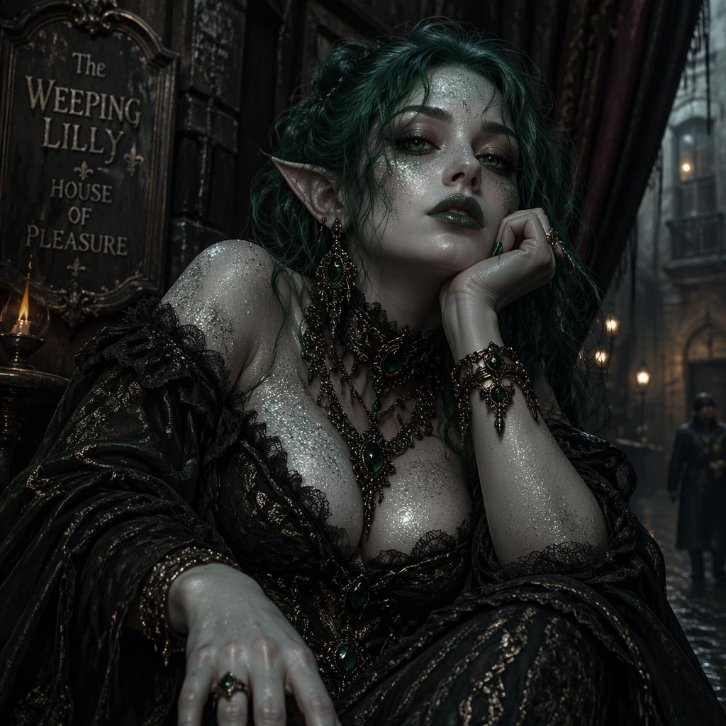 Halfling female prostitute with green hair and ghost white skin covered in silver glitter. She wears gothic clothing and...