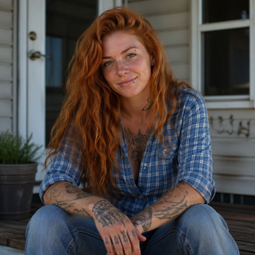 Human female with tan Caucasian skin covered in freckles. Her hair is reddish orange, long and curly. Her eyes are green...