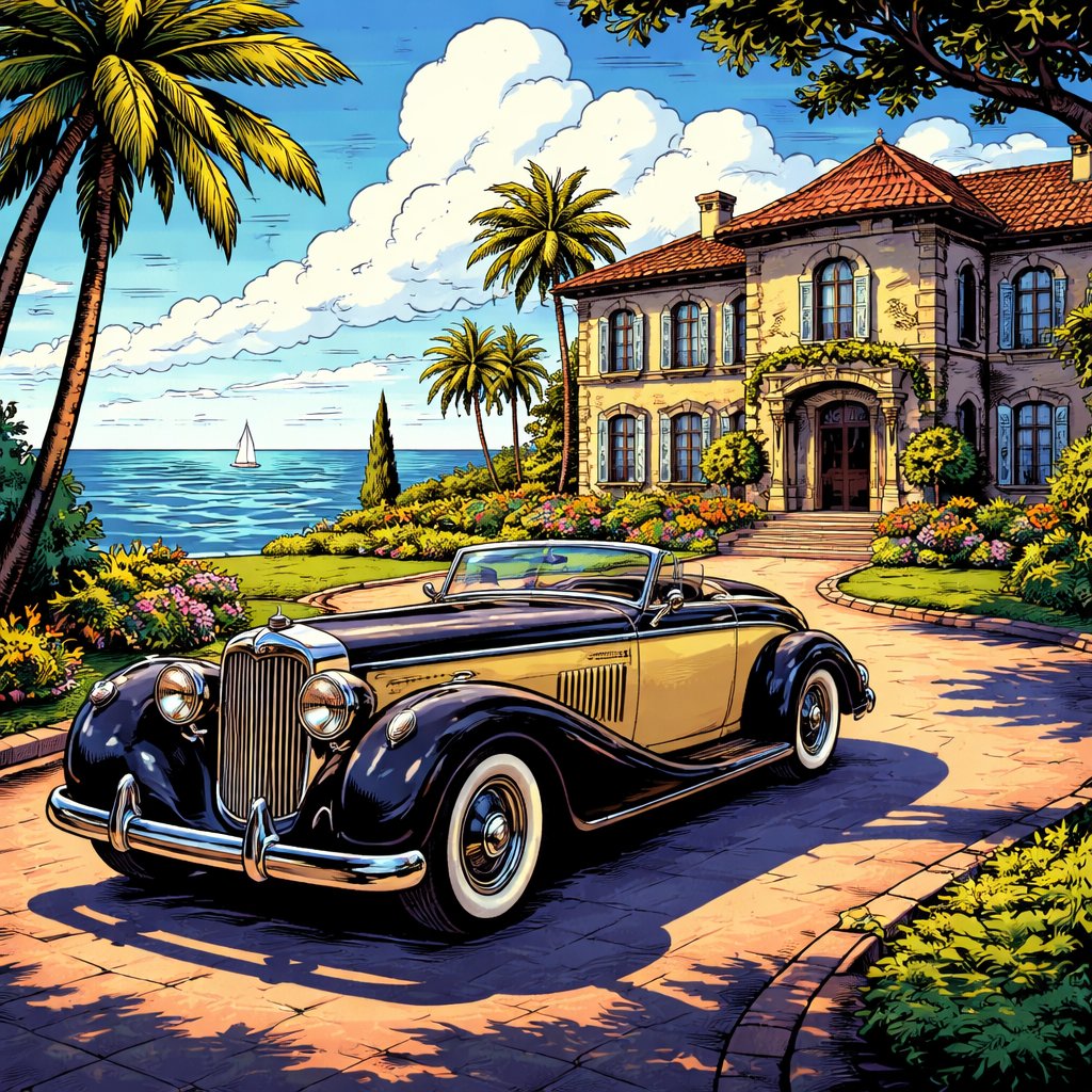 afternoon. A 1930s style car is parked in the driveway of a large mansion which overlooks the ocean.