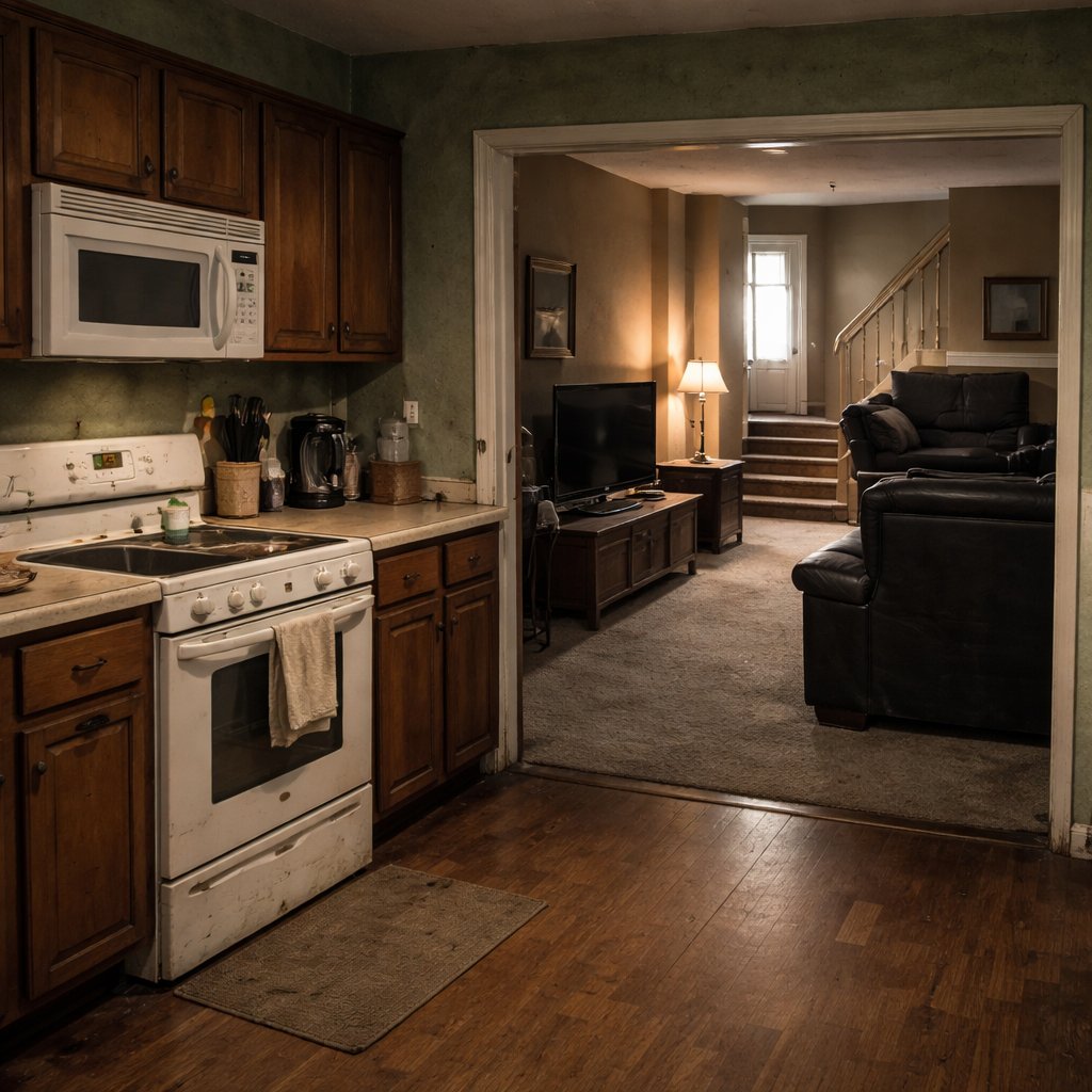 A kitchen that has green walls and brown cabinets. The oven and microwave are white and look run down. The floor is a wood that looks dull. The kitchen opens up to another room that has a black couch and TV. Behind the couch are stairs that lead upstairs. The floor is a dirty white carpet. There is no front door.