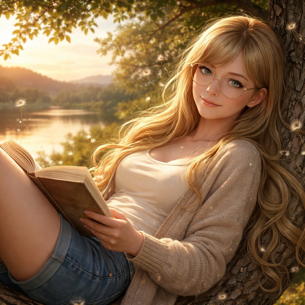 A girl with long blonde hair and green eyes she has golden thin glasses. He is laying on a tree reading a book. Dandelion seeds float all around her there is a lake in the distance shining with the sunset