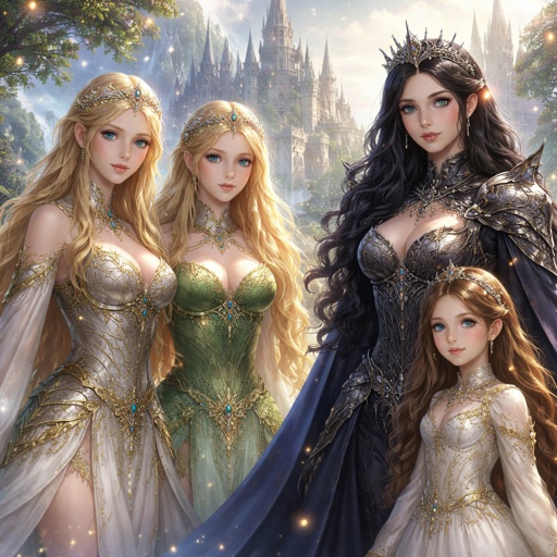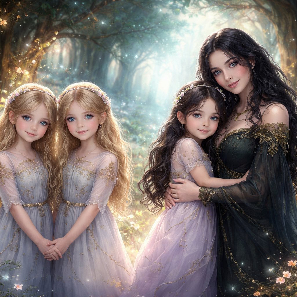 Twin sisters with blonde hair and a black haired women with her daughter