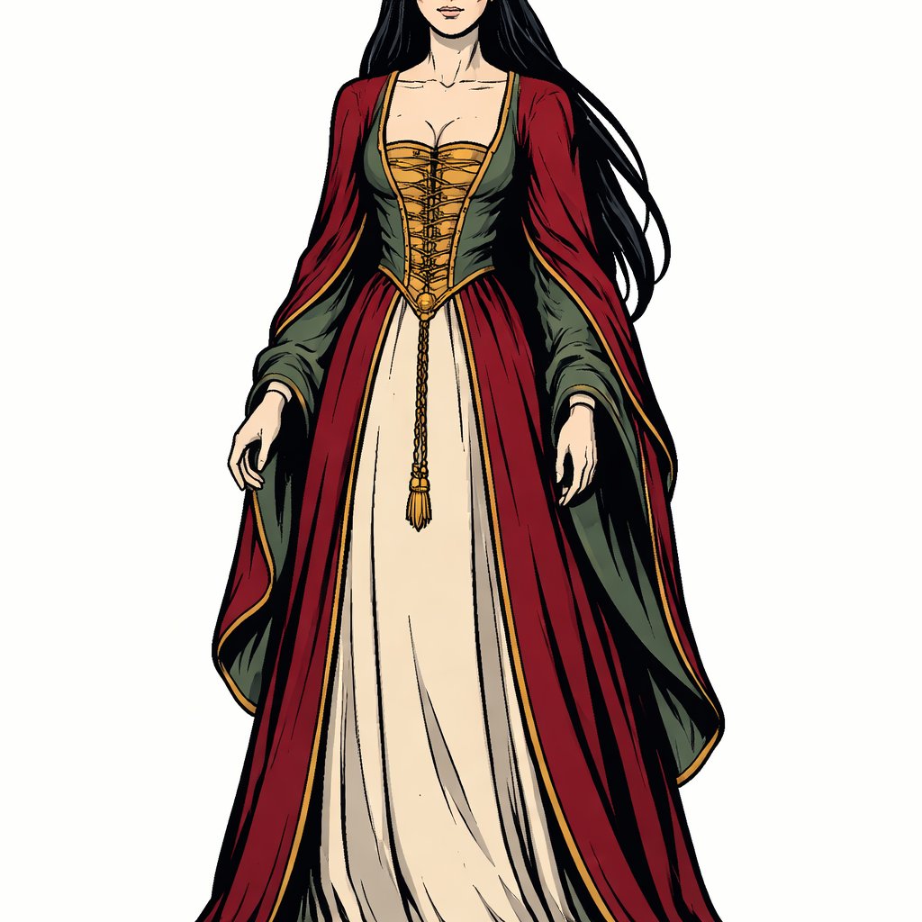 No caricatures no speech bubbles a slim tall modest woman with long black hair in renaissance robe. front view