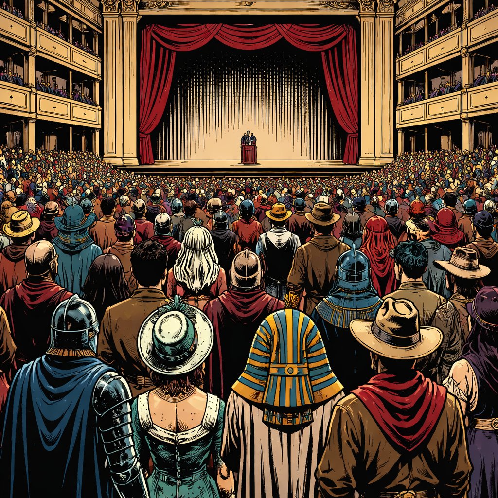 Realistic, refined, long distance shot of a grand procession of people in wildly different costumes of different times up inside an auditorium. we see only their backs as they’re facing the stage.