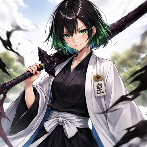 Girl with Short black hair with green tint stripes with a dark zanpakuto with a lieutenant uniform