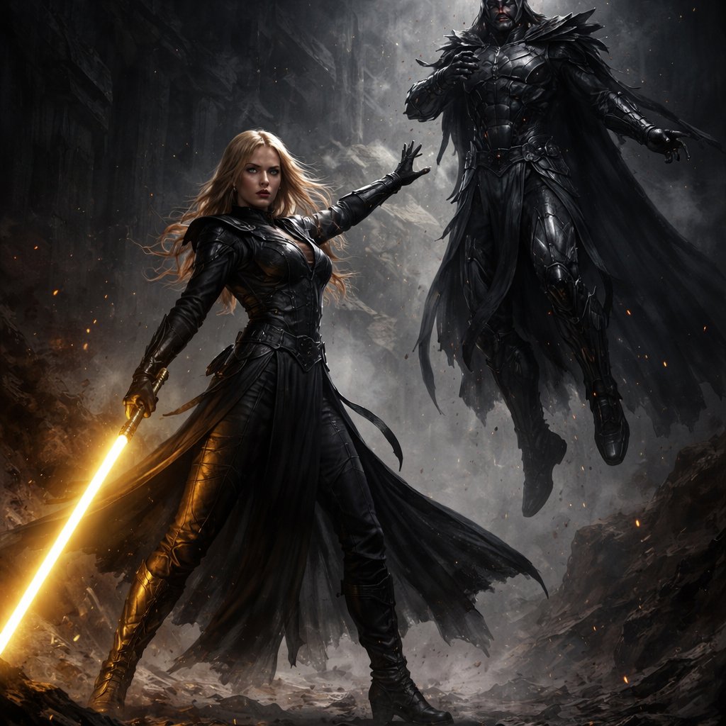 A full body picture of a female blonde Jedi in a black combat outfit holding a yellow lightsaber suspending a tall black sith in silver armour by the Force