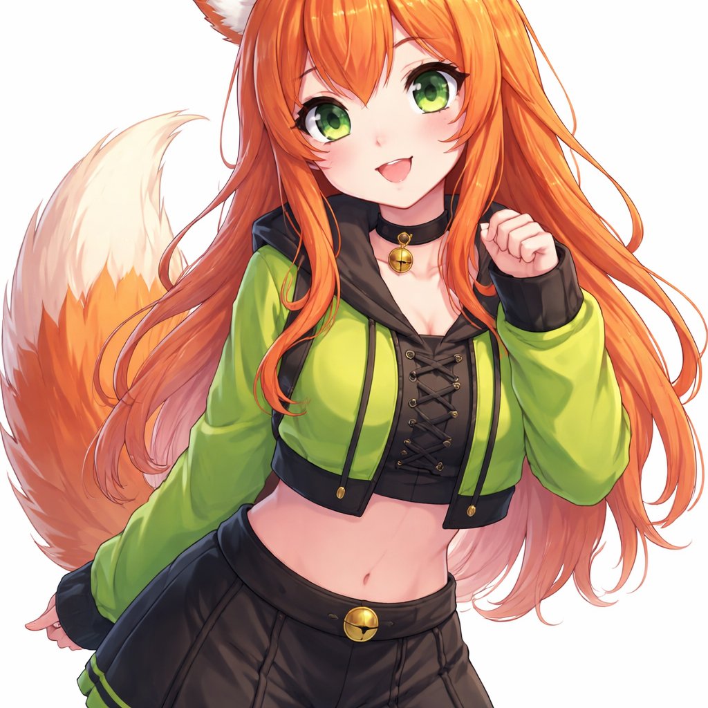 A girl with fox ears, green eyes, peach skin, orange hair, wears a fox tail, and wears green and black