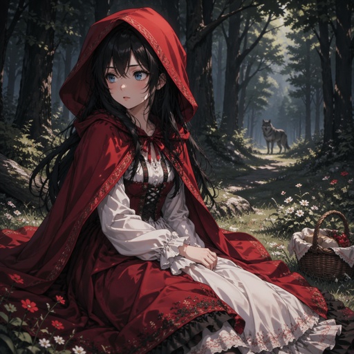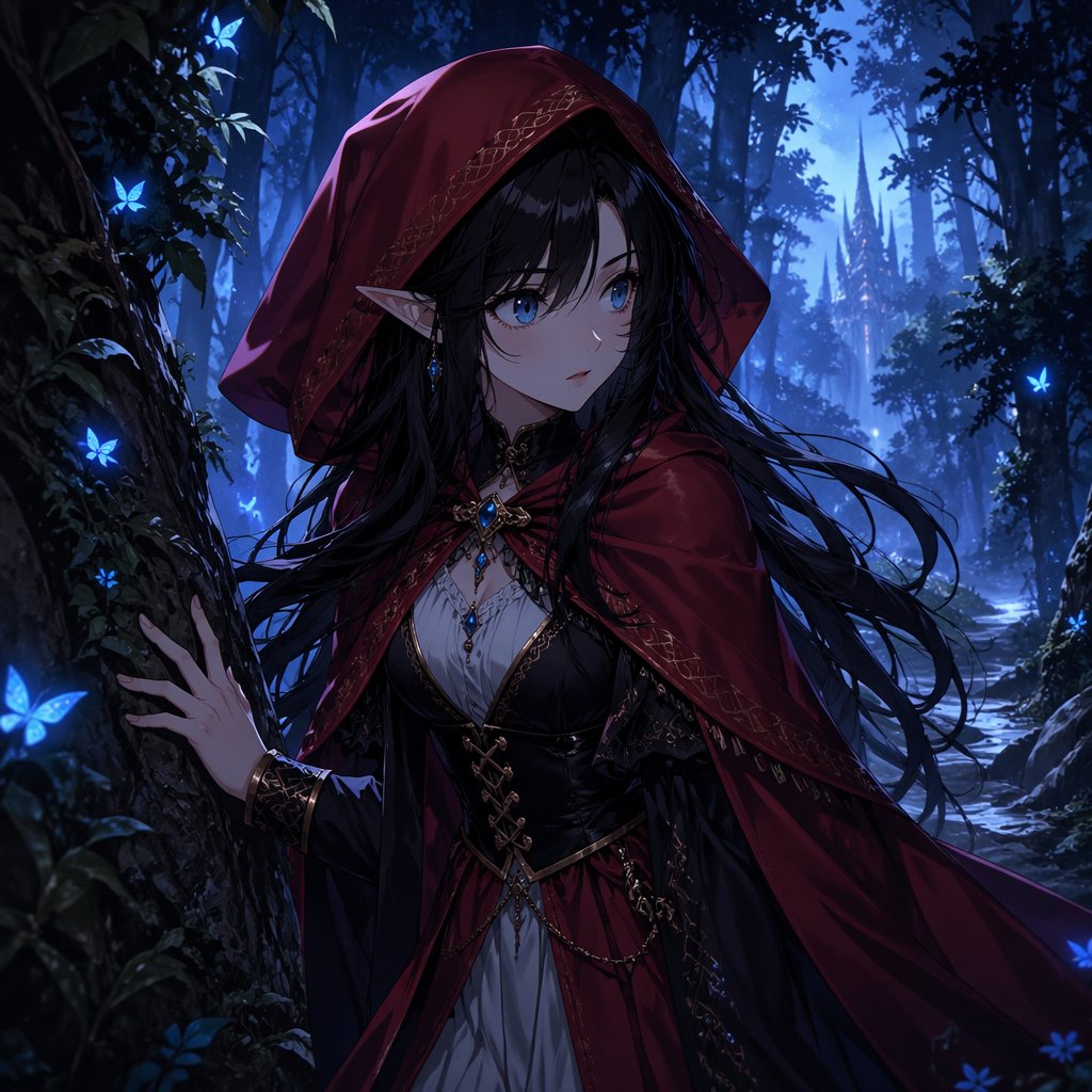 Beautiful elf girl black hair in the middle of the woods, making sure she’s not being watched. She has a red hood on with a gorgeous gown. She has blue eyes. Her age is 16
