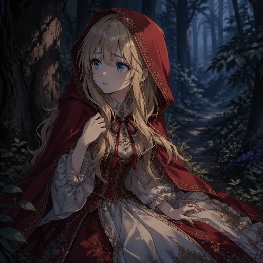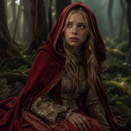 Beautiful blonde girl sitting in the middle of the woods, making sure she’s not being watched. She has a red hood on wit...