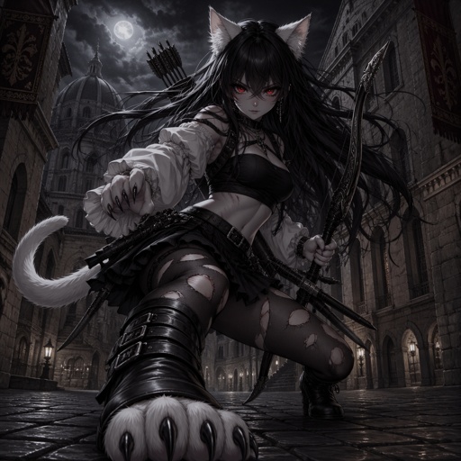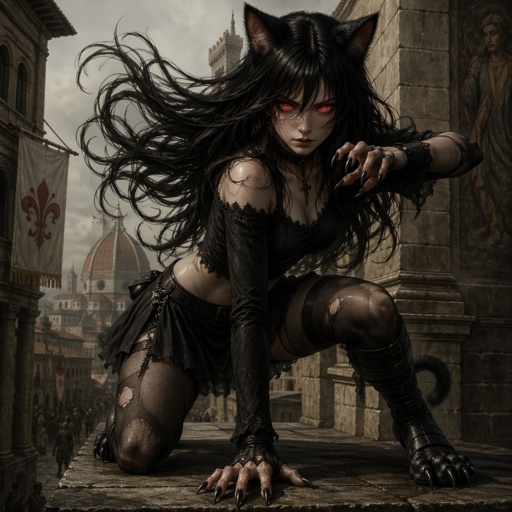She’s a white cat girl with long black hair and she was born in the renaissance, she has a black belly shirt and black m...