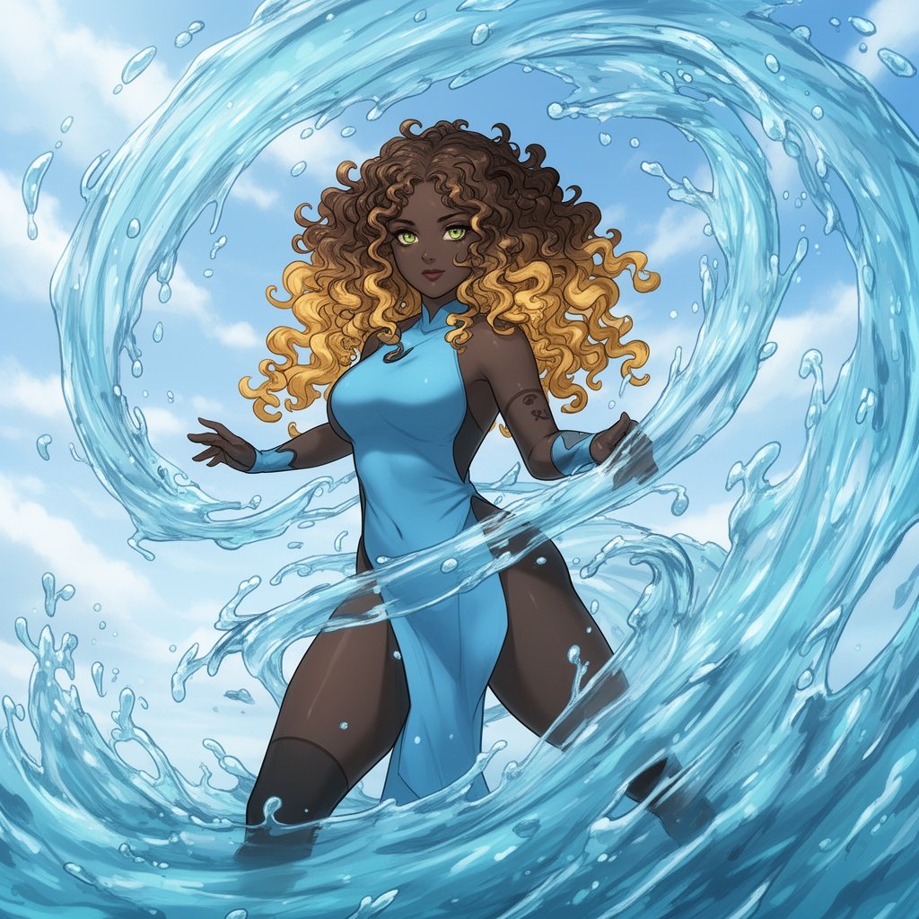 Black female with curly honey blonde , hazel green eyes and a curvy figure who's a water bender
