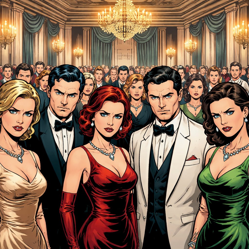 Realistic, refined, no caricature, an elegant ballroom, a group of of men and women in their 30s stare at the camera wit...