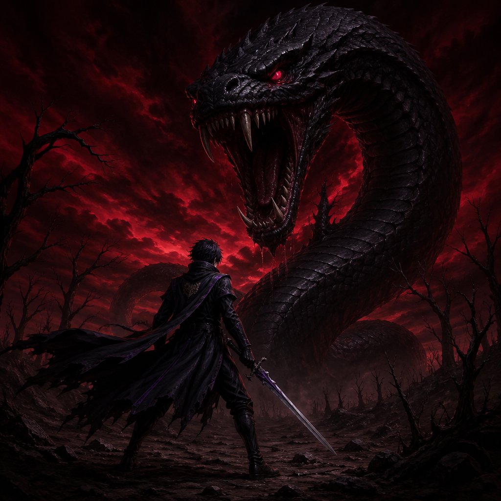 They sky is a deep red color and the clouds are black. At a distance you can see a huge serpent that is all black and has glowing red eyes and sharp teeth. Standing in front of the serpent is an 18 year old prince who has black hair with purple stripes. He stands looking at the serpent holding a sword and is ready to fight. The serpent looks on the prince with an open mouth and is looking down at him. There are trees around them that are dead. The ground is nothing but dirt.