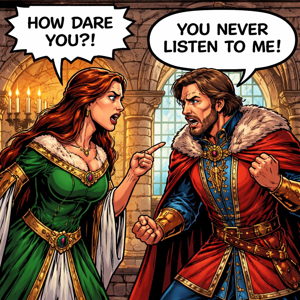 Mediaeval noble dressed husband arguing with wife in a castle room