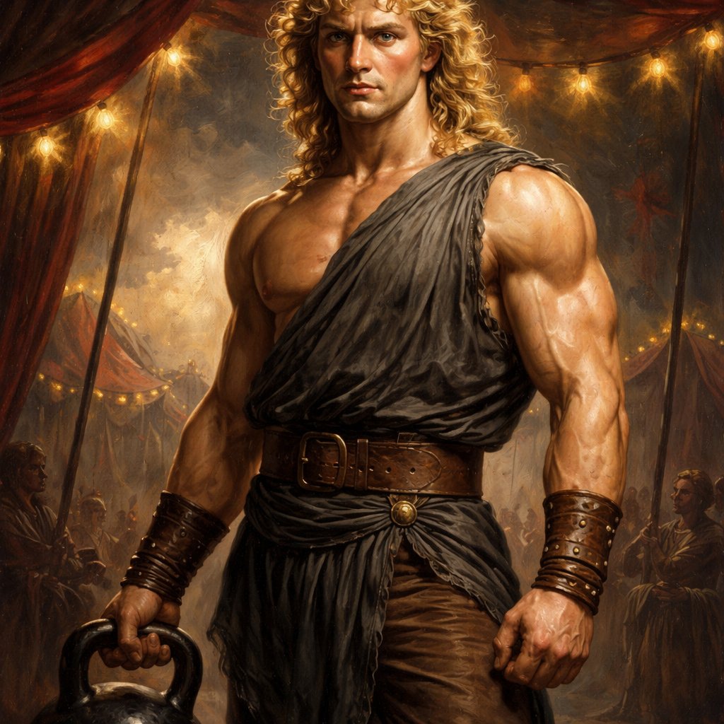 A tall well~proportioned male, so handsome he looks like a Greek god with muscles. With deep-set blue eyes and strong brows, and a peaceful but determined expression on his face. His hairstyle is a thick curly blonde mullet. He works at freak show as a strong man. His outfit consistsed of a Charcoal-toned sleeveless Greek tunic, thick leather belt, leather wristbands/cuffs, brown pants.