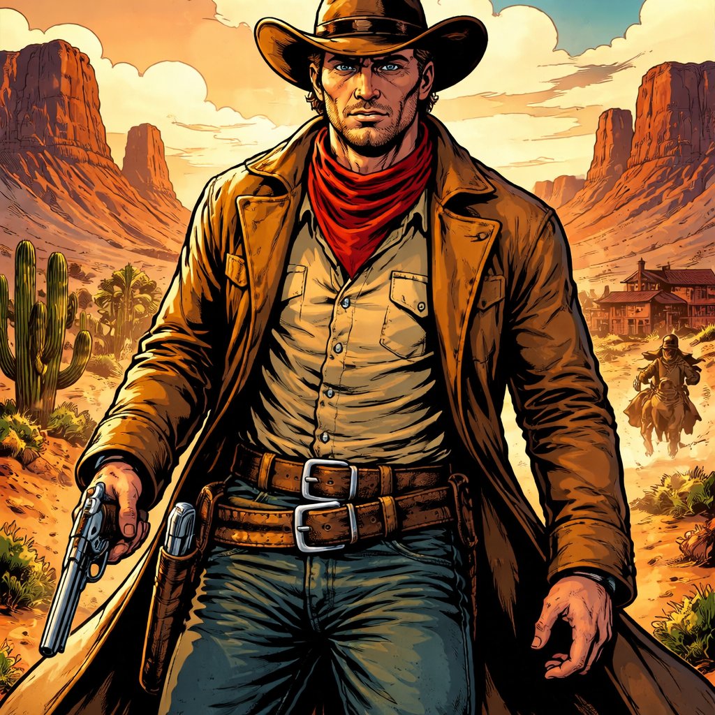 Cowboy bounty hunter from 1882 with a short bushy beard, a rifle strapped to his back, a revolver in its holster, wearin...