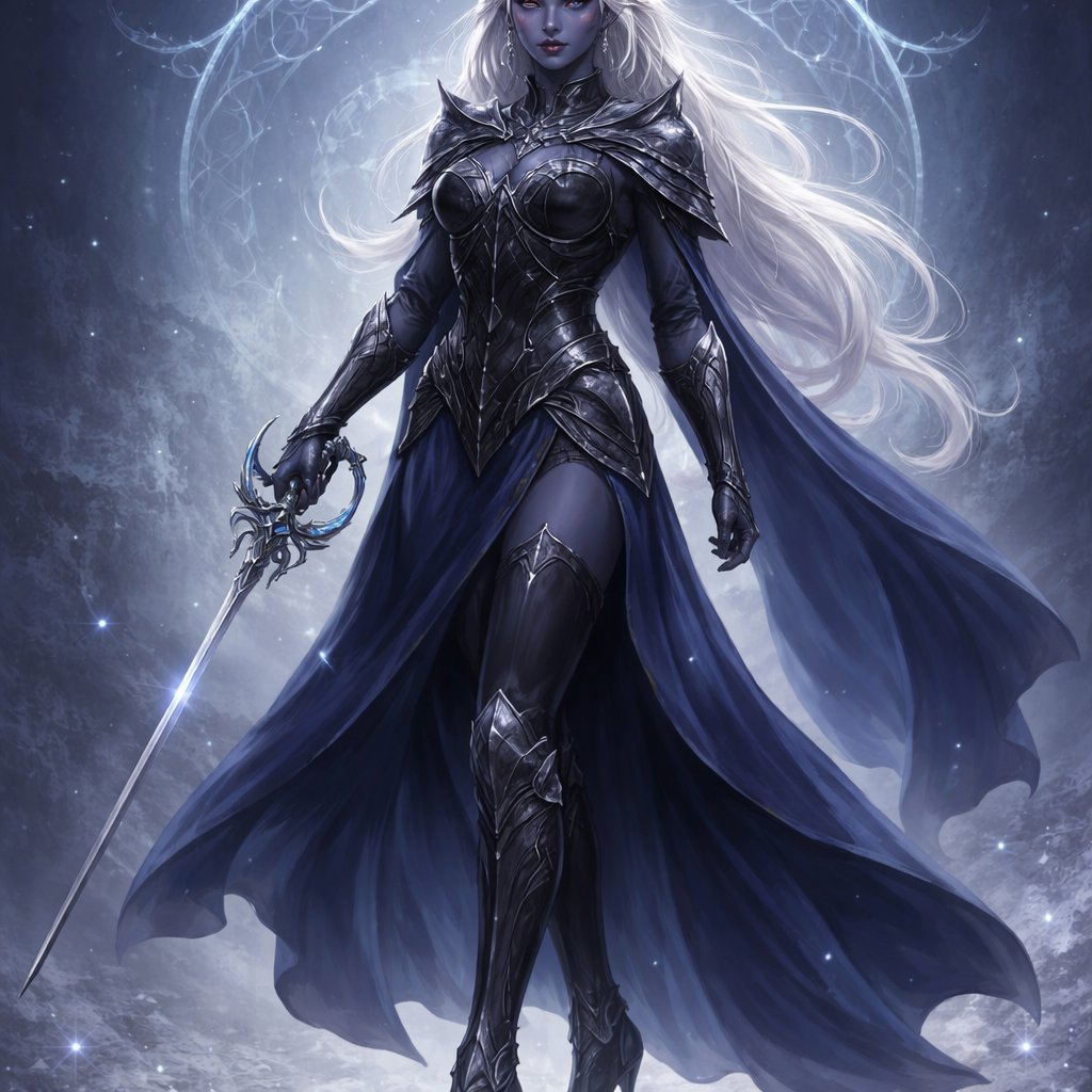 A beautiful Drow woman with long flowing white hair, dark grayish blue skin, large silver eyes, wearing dark blue flowing robes with armor plates, knee high heeled armor boots with Eilistraee’s symbol surrounding her. Carrying a long detailed rapier. Full body picture