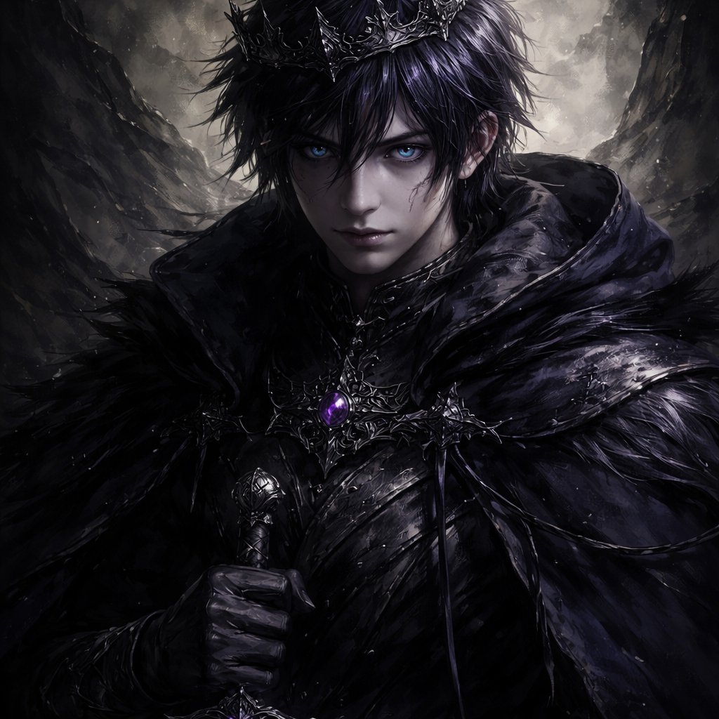 An 18 year old prince who has black hair with purple stripes. He has dark blue eyes. He looks strong.