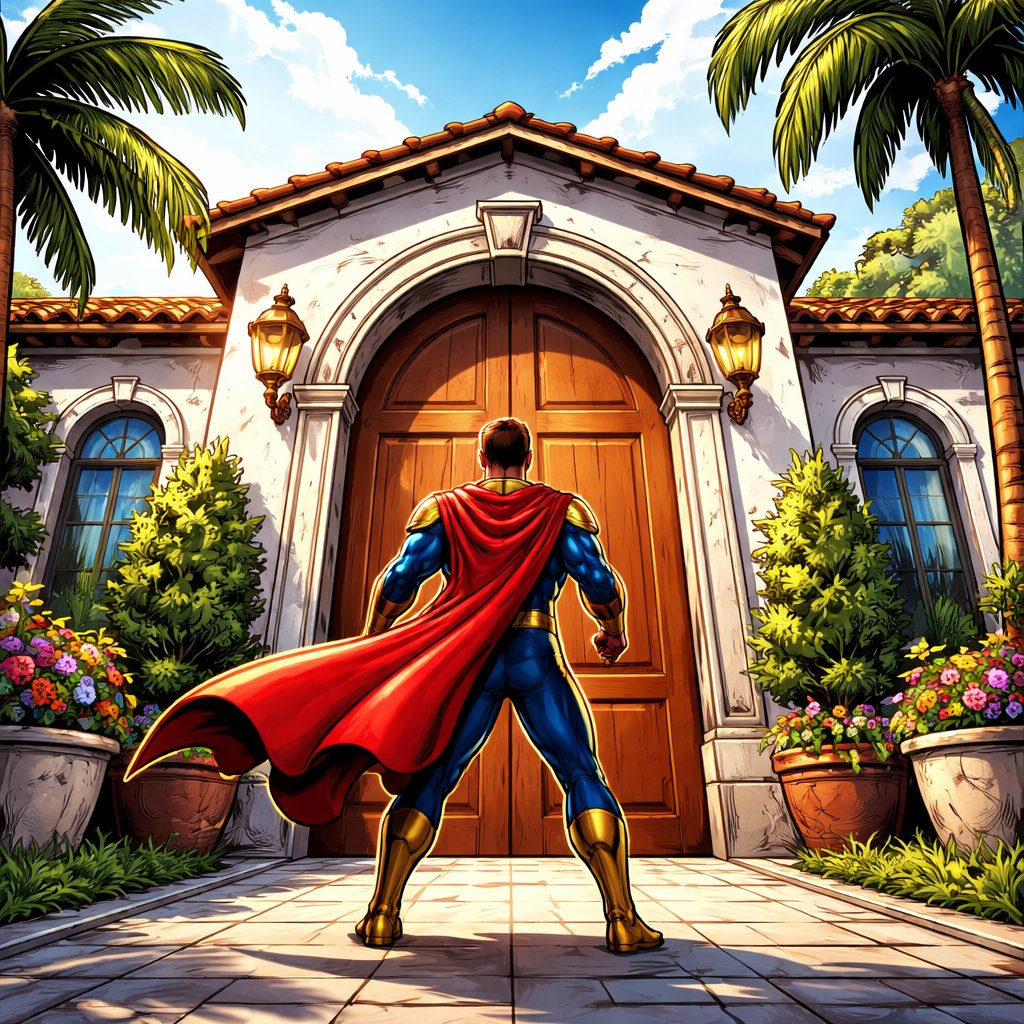Left side of image- A person in strange colourful costume stands at the door of an expensive villa. Bright day. The door is closed. Realistic