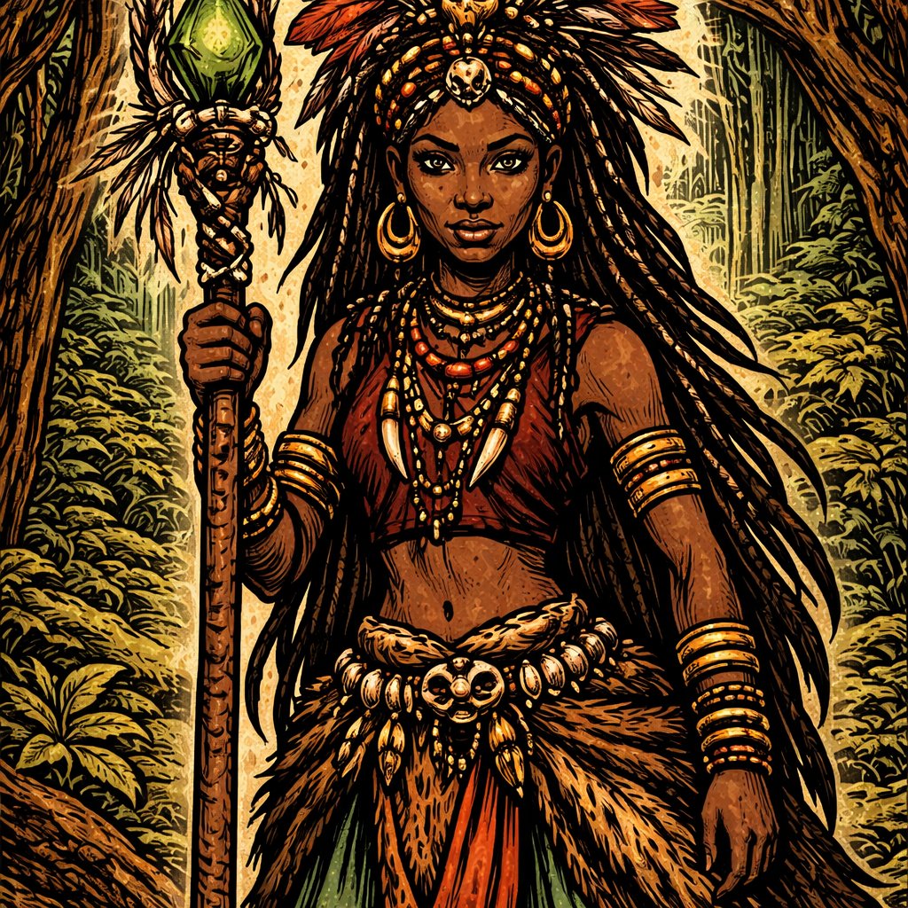 An african witch priestess from the forest tribe holding a wooden staff. Thick body mid heavy weight.