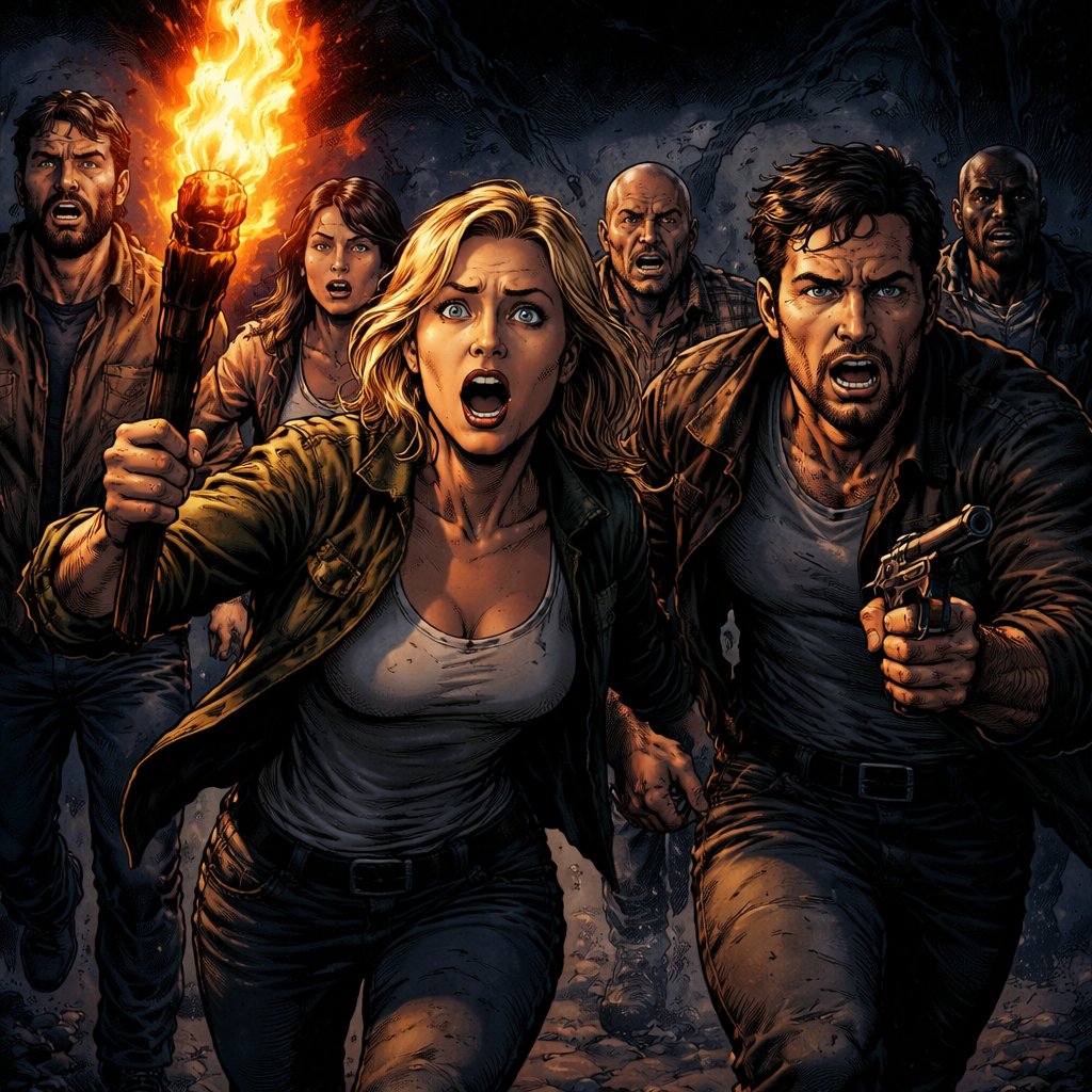 Realistic, refined, no caricature from the front we see a group of men and women holding a torch another a firearm and they’re running away in fear toward the camera It is very dark.