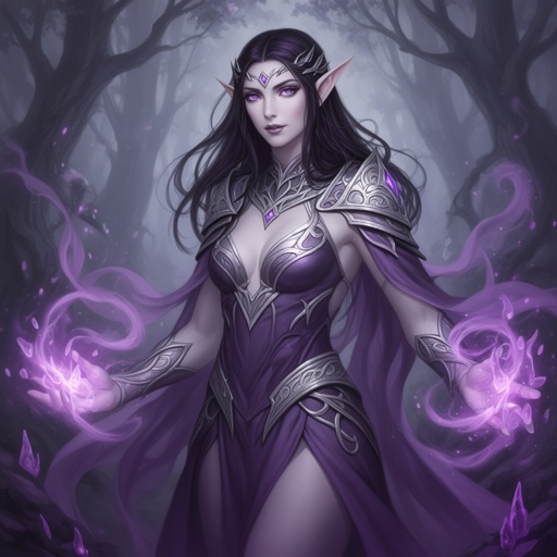 Dark hair woman. Pale and beautiful. Lean and strong. Amethyst eyes. Wearing silver and purple.