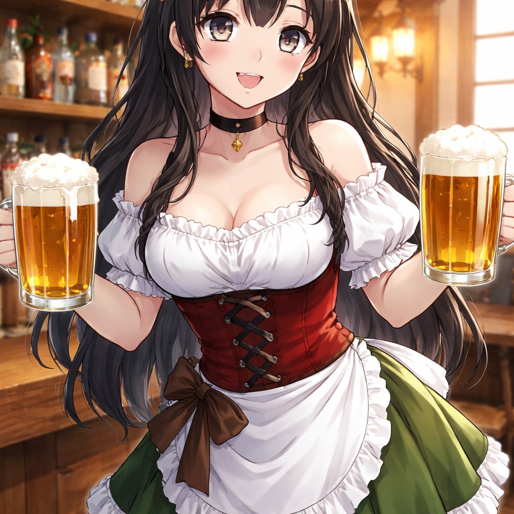 Barmaid, Female, human, Dark hair, silver eyes, Sweet, holding drinks, mature, zoomed out