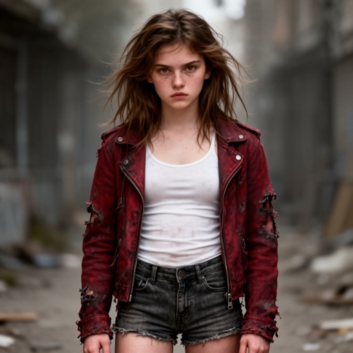 16 year old girl with long brown messy hair down, very light brown eyes, pale skin, dark red beat up jacket, white fitte...
