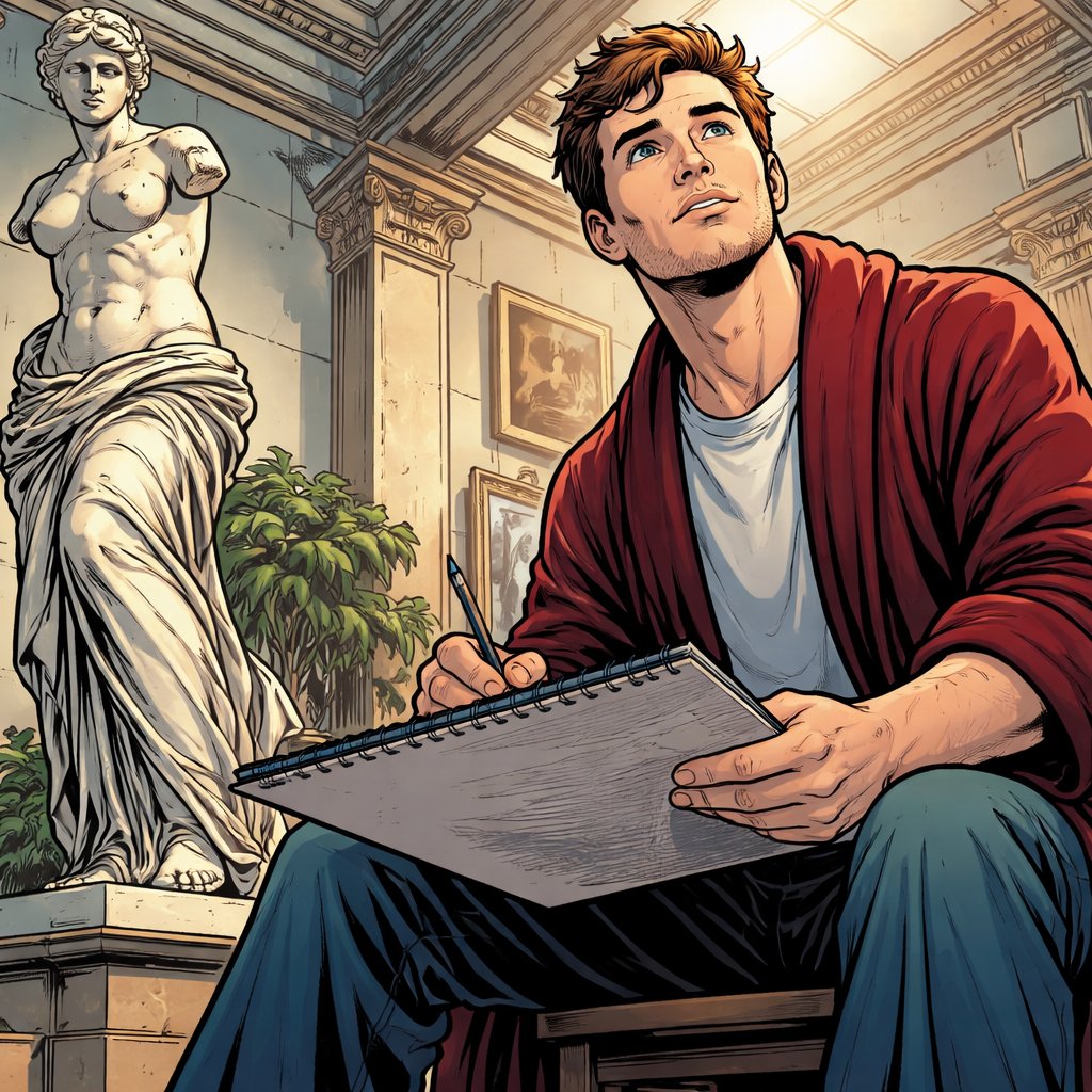 Realistic, refined, no caricature no speed bubbles a young man in his 20s in a robe is sitting with a drawing pad looking up at a sculpture low drones view 3/4 from the front.