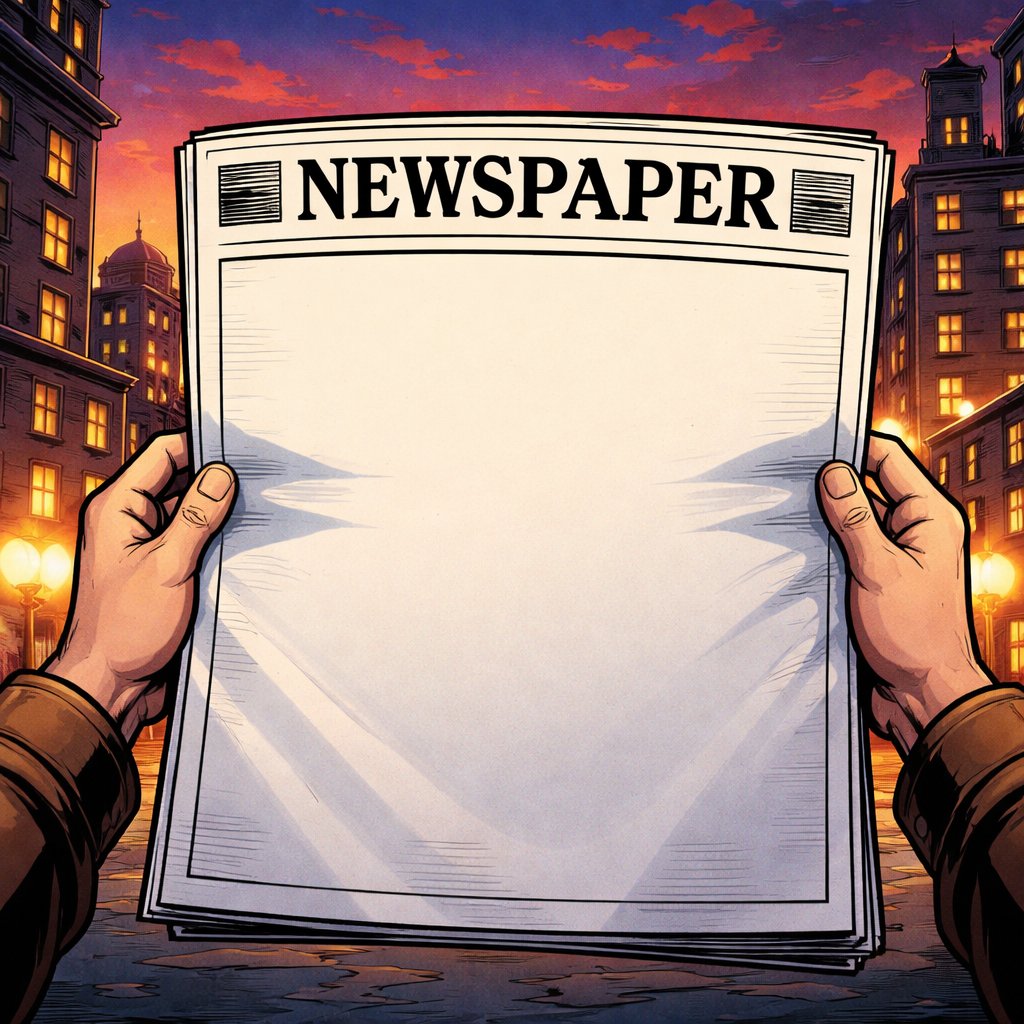 An open blank newspaper is held. It is evening