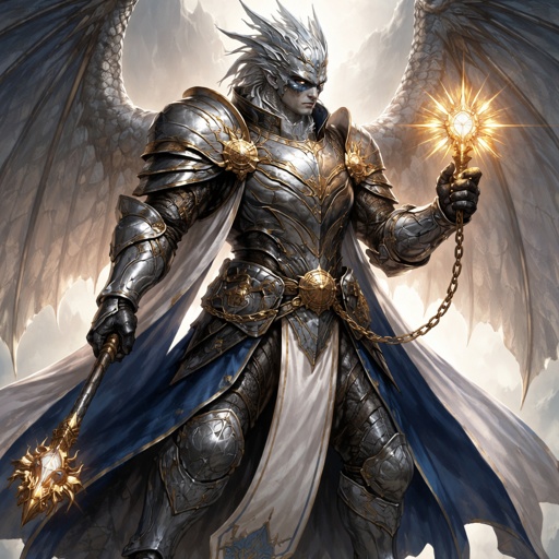 Aasimar blue eyed, shaved head, muscular, wearing full plate armor with cape, wielding holy sword. Fighting against a de...