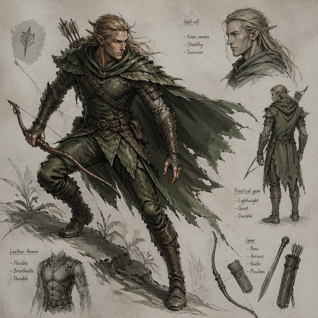Male elf ranger with long copper hair, fair skin, hazel eyes. Earth tone leather armor. Has a longbow and quiver with ar...