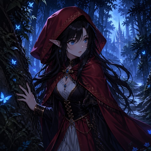 Beautiful elf girl black hair in the middle of the woods, making sure she’s not being watched. She has a red hood on wit...