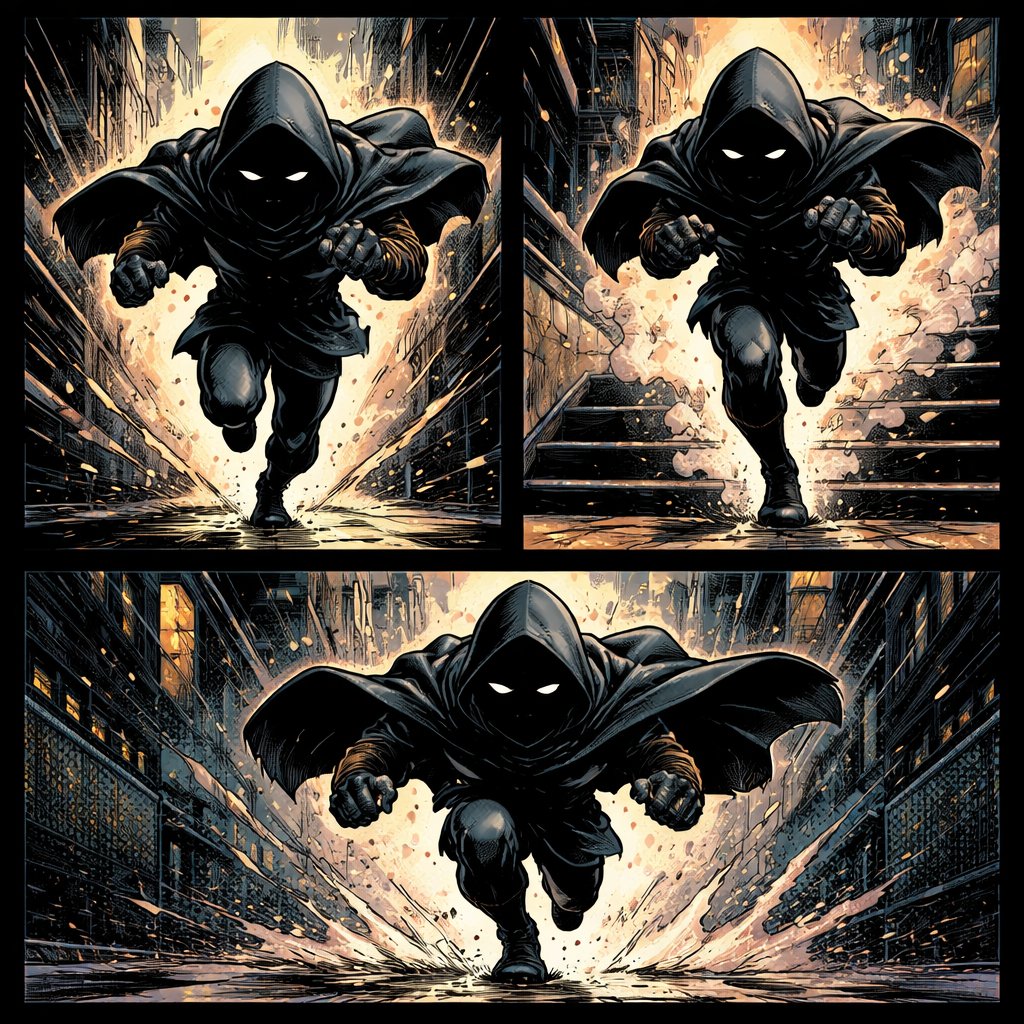 Refined realistic no speech bubbles. A small figure in a cloak is running out of frame toward us. Three views.
