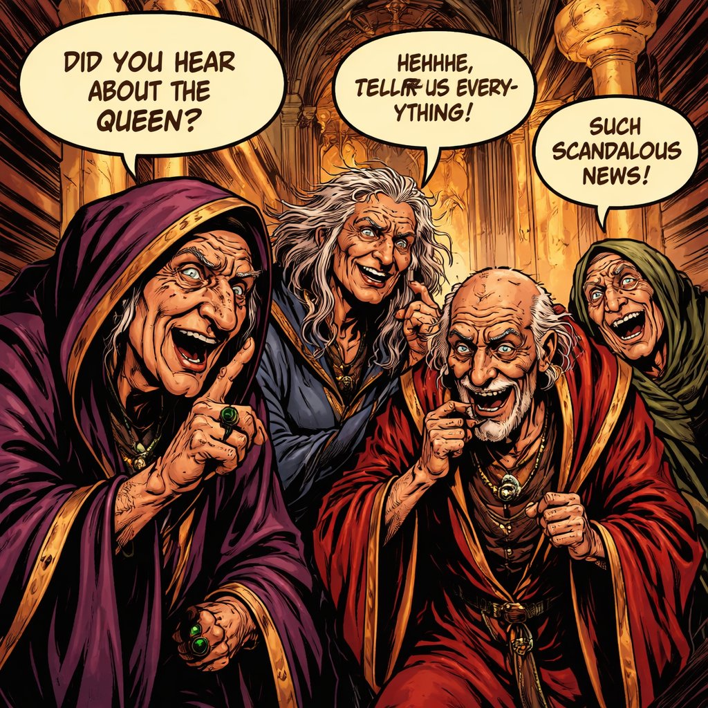 Realistic refined no caricature a group of unpleasant old people in robes are gathered in a palace gossiping