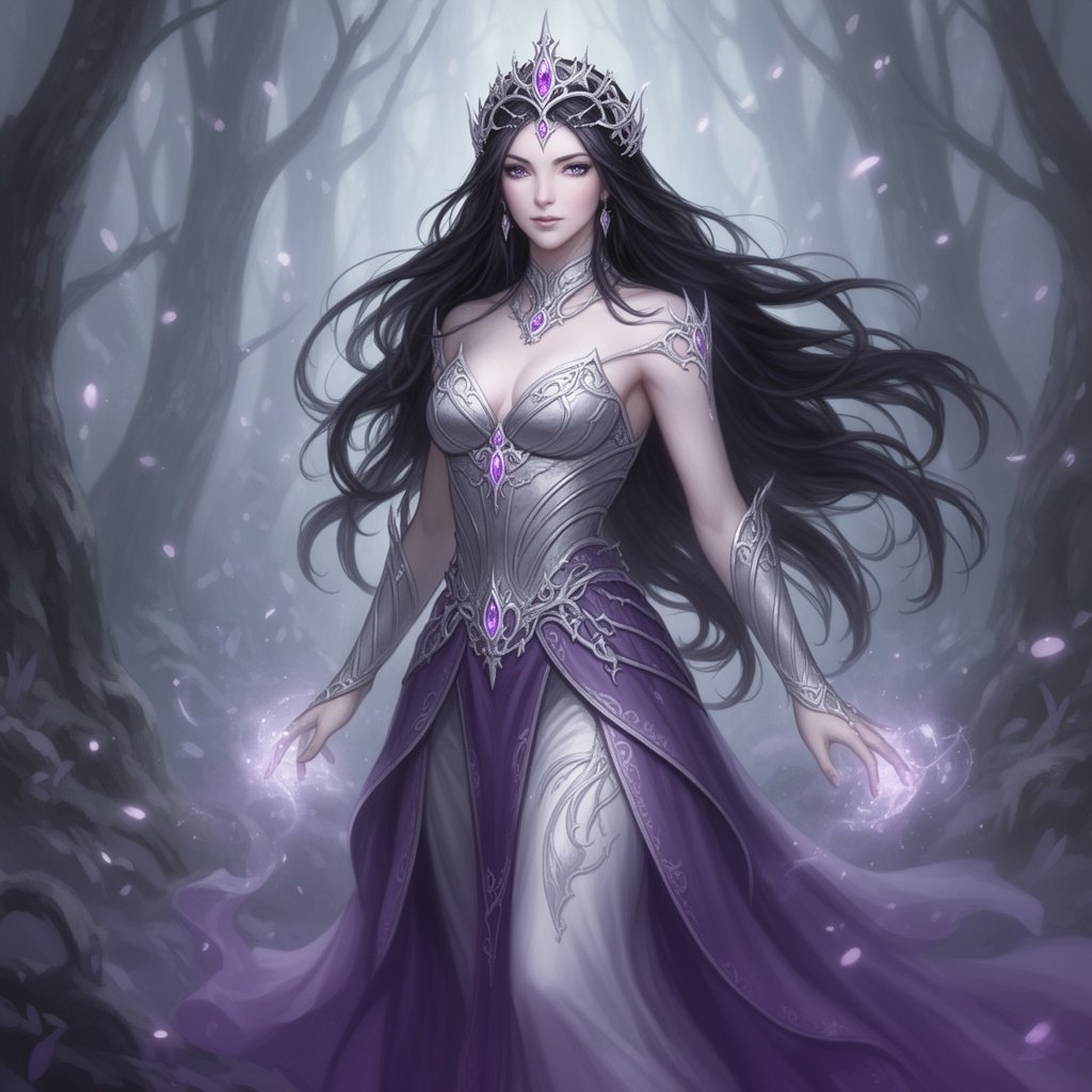 Dark hair woman. Pale and beautiful. Lean and strong. Amethyst eyes. Wearing silver and purple.