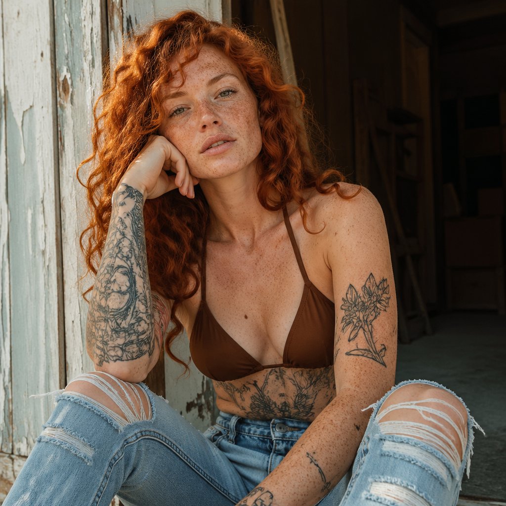 Human female, early twenties, curly reddish orange hair. Covered in freckles and tattoos. Wearing ripped jeans and a bikini top