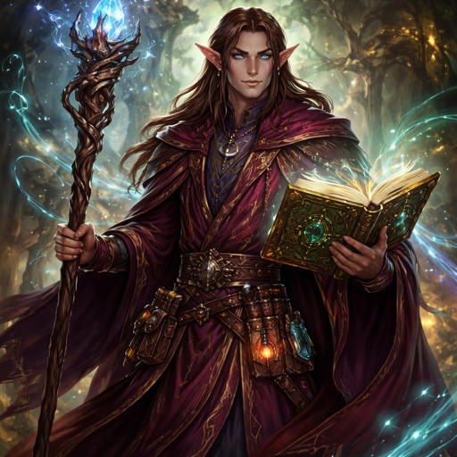 An elf wizard trained as a classic mage. He has nut brown hair, bluegrey eyes, dark red and purple clothes, a green and ...