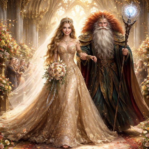 One woman with green eyes, wearing an ordinate gold wedding dress, walking down the aisle with an older man with a puffy...