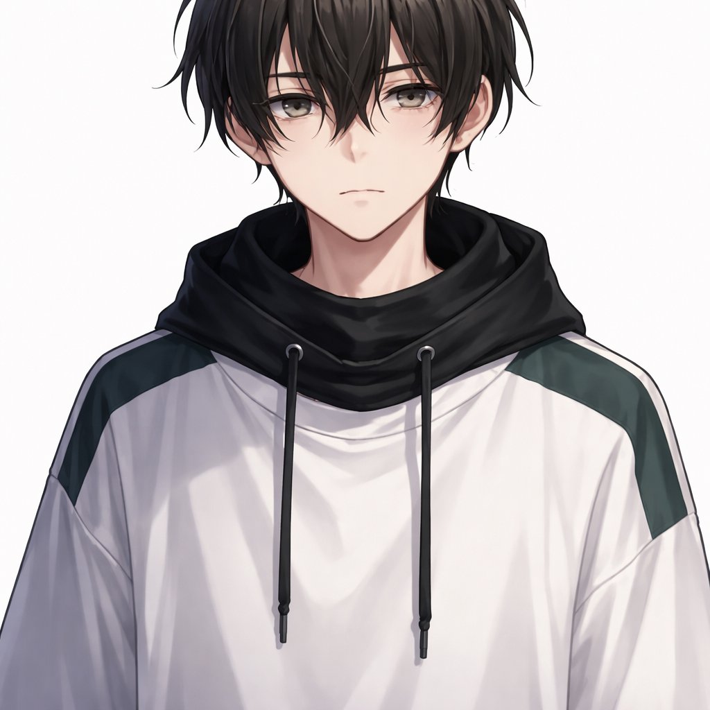 Boy 18 years, Black, short hair, bangs on left side longer and over the eyes with middle part free hair, hoodes gray eye...